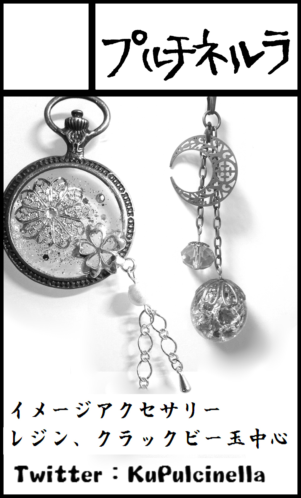 アクセサリー 2015/01/14 販売するハンドメイド雑貨について 一度きちんと記載しておかねばと思い後回しにしていた注意事項等書かせて頂きます。 素人制作ゆえ、パーツの劣化やレジンの黄変があることがあります。 お値段はギリギリのところで抑えているつもりではいるのでご了承くださいませ。 また、壊れた場合など治せそうでしたら修理、付け替え等も承ります。ご相談ください。 (一瞬で壊れた!とかなら話は別ですが) 当サークル(そしておそらく多くの雑貨サークル)で使用しているパーツ、チェーンの多くは 海外からの輸入モノであり、あまり状態の良い金属とはいえないものが多く含まれております。 特にチェーンは肌の弱い方など特に使用する際お気を付けください。 (私自身も夏場素肌につけると市販のものでもひどいかぶれを起こしたりします) ピアスに樹脂素材のものを使うなど対応できる場合もあるのでご相談ください。 相談、ご質問の際は販売するときにつけさせていただいた名刺のアドレス、 またはTwitter【@KuPulcinella】Pixiv【ID:1253424】メッセージ等でお願い致します。 くるるさくら