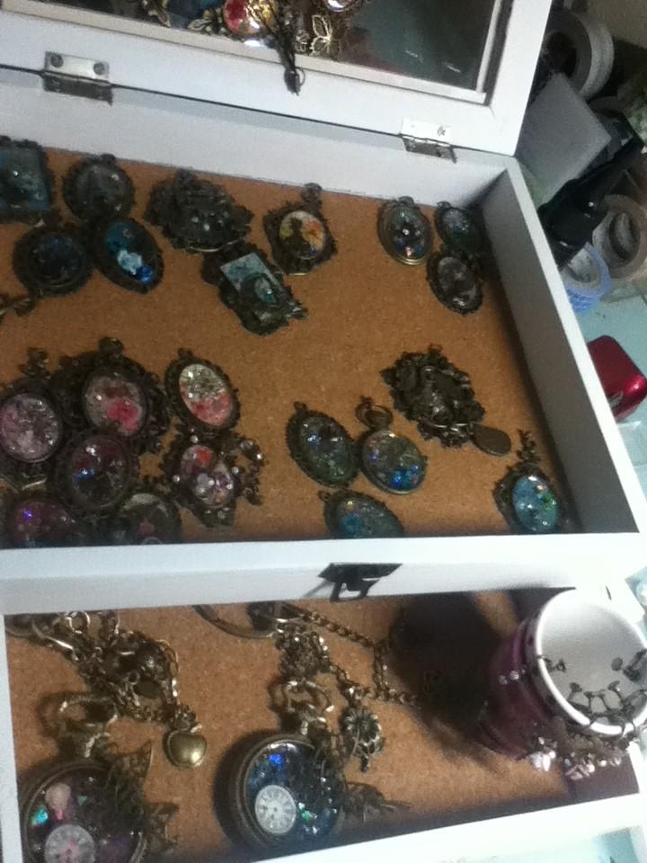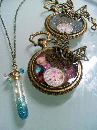 アクセサリー 2012/10/24 試験管アクセ! 浅草橋の瓢箪屋さんにて買った試験管パーツをアクセにしてみました! なかなか・・・。しかし作業はとっても細かくて大変でした(☝ ՞ਊ ՞)☝ パーツ自体はガラスで結構しっかりしているつくりですが、ネックレス以外にするのは少し怖いので。。。 おくのピンクの懐中時計はUVじゃないやつでやったので、うまくいくか・・・
